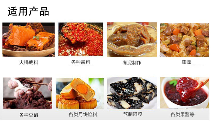 適應于各種高粘度醬料的混合攪拌加熱蒸煮炒制:焙烤餡料炒制業(果醬、蓮蓉、豆沙、水果蓉、蜜餞、棗泥)、肉制品熟食加工業(鹵味、肉醬、牛肉醬、海鮮醬)、調味品業(火鍋底料、方便面醬料、香其醬)、糖果業(果醬、糖料)、蔬菜玉米加工業(香菇醬、辣椒醬)、酒店用品及快餐(食堂熬湯、炒菜、燉肉、熬粥)等食品加工業以及日用化工、制藥等行業的攪拌混合。