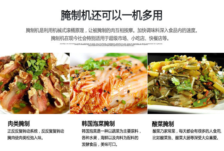 滾揉機(jī)是利用物理沖擊的原理,讓肉在滾筒內(nèi)上下翻動(dòng),相互撞擊、摔打、達(dá)到按摩、腌漬作用。